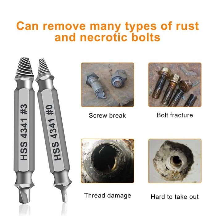 - This damaged screw remover tool kit is made from High-Speed Steel H.S.S 4341# , which have high hardness of 63hrc, it’s durable and easily to remove any damaged screws.